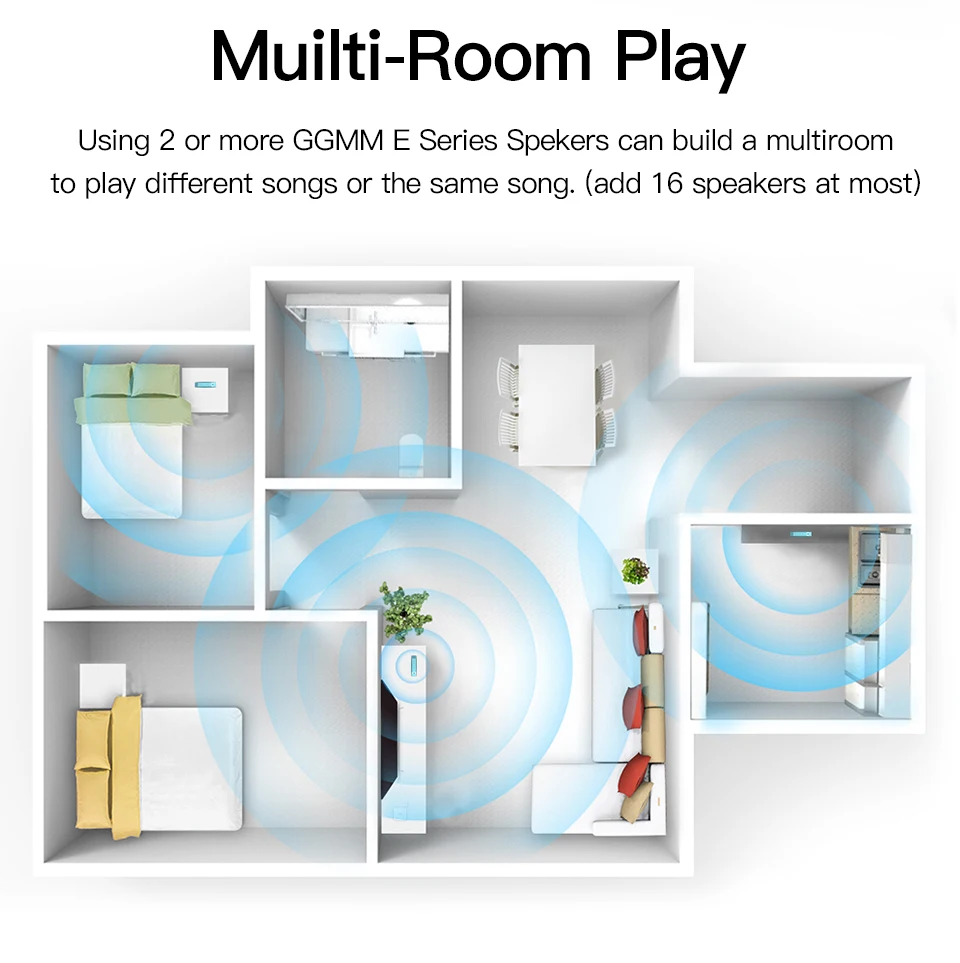 Using 2 or more GGMM E Series Speakers can build a multiroom to play different songs or the same song. (add 16 speakers at most)