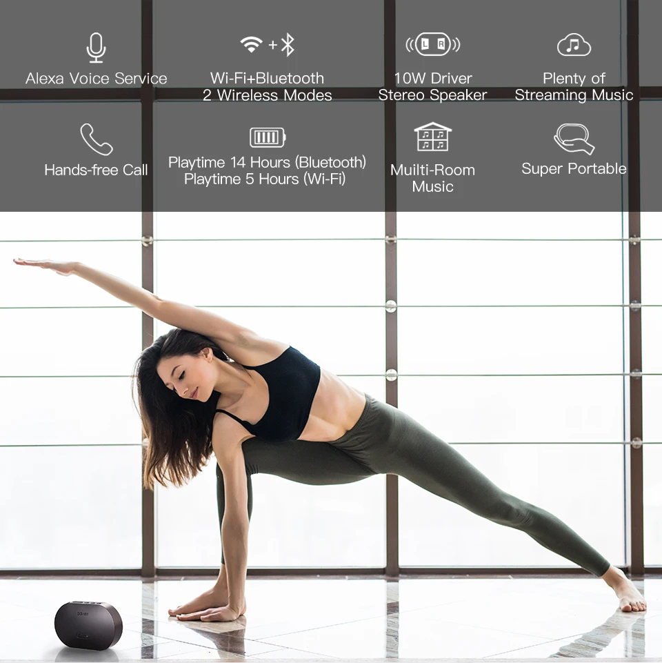 Alexa Voice Service/Wi-Fi+Bluetooth 2 Wireless Modes/10W Driver Stereo Speaker /Plenty of Streaming Music/Hands-free Call/Playtime 14 Hours (Bluetooth) Playtime 5 Hours (Wi-Fi)/Muilti-Room Music/Super Portable