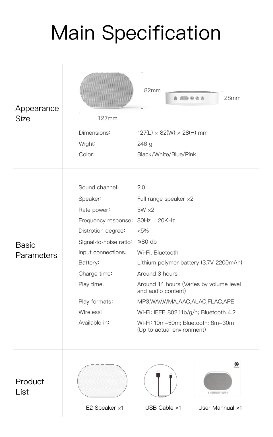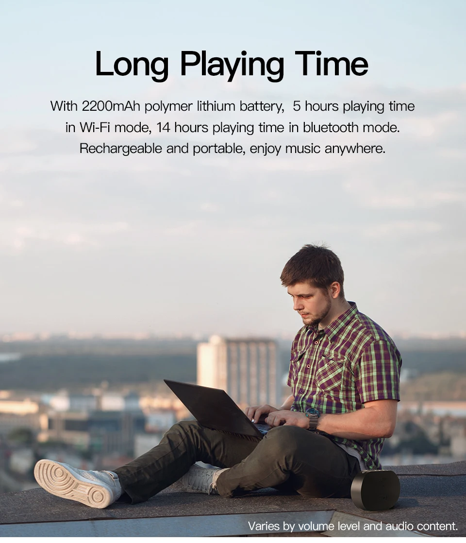 -Built-in 2200mAh lithium battery provides up to 14 hours of continuous play(bluetooth mode) wifi mode will up to 5 hours